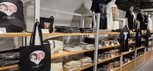 Tシャツやサコッシュなどのアパレル関連が並んだ棚