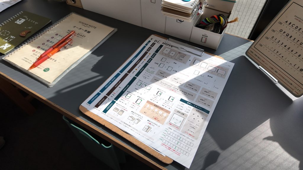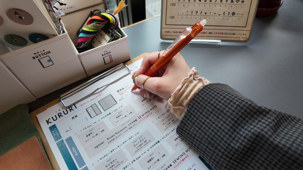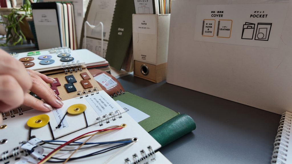 ノートの基盤はダイアリーかノートの2種類ですが、店頭にはオンラインストアにはなかったKURURIカバー(レザー素材を裏表紙から表紙に巻くスタイル)の見本が私好みだったので、そちらを参考に、中紙の仕様をダイアリーに決めました。